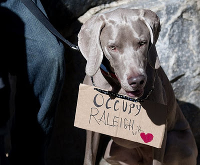 A small group of Occupy Wall Street protesters pose for a picture at the welcome sign on Rhode Island Avenue. It's not fair that 99 percent of the dogs have 1 percent of the bones! Or wait, the other way around! Woof! But a number of the protesters have brought along some furry support. The four-legged kind are in on this, too. On October 1st, 2011, the 15th day of the 'Occupy Wall Street' demonstration against the nation's financial system, Here are dogs that have taken to the streets to protest against corporate greed. Dogs are part of the 99% too! Collected here are a handful of images of the protesters occupying Wall Street from the past two weeks.